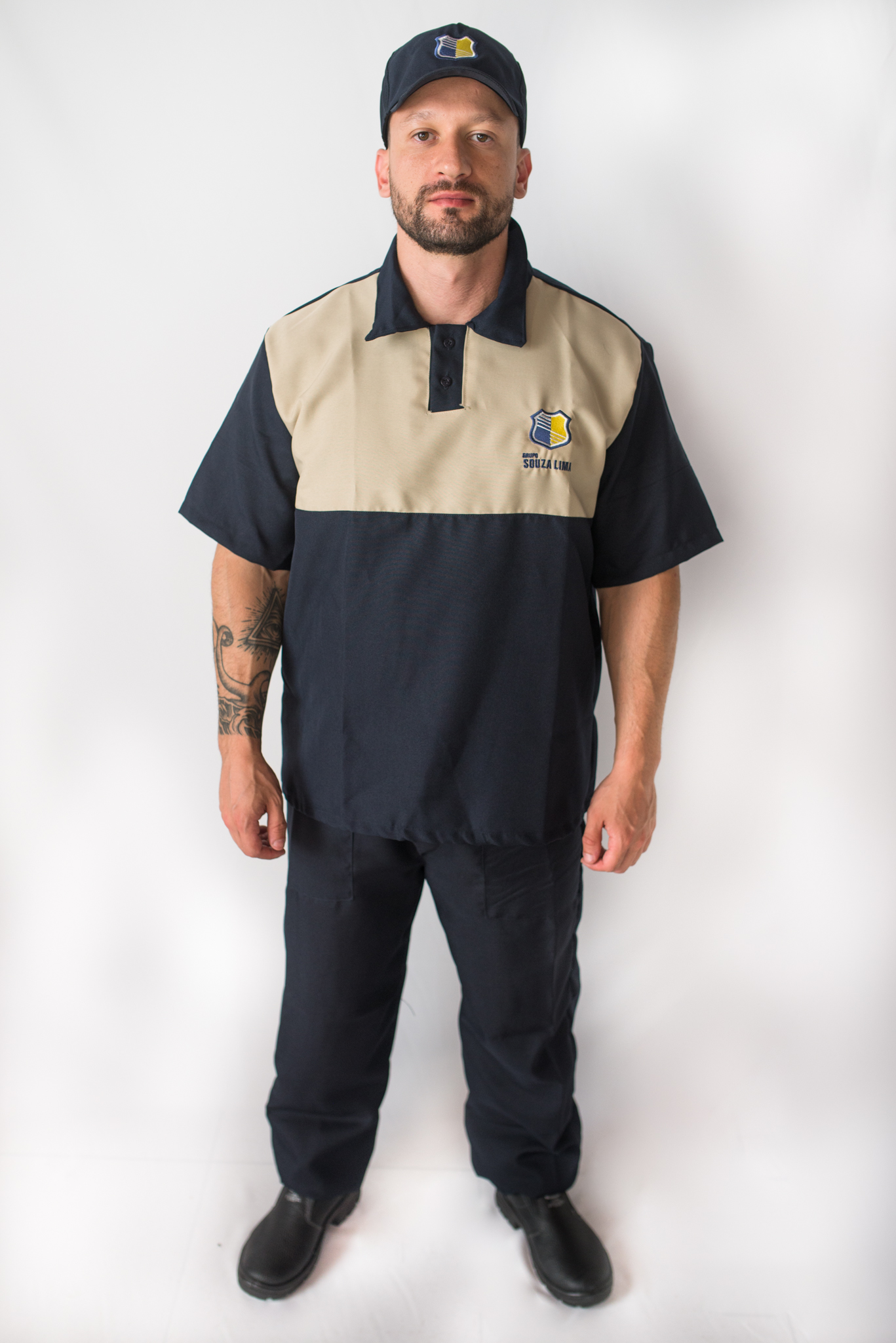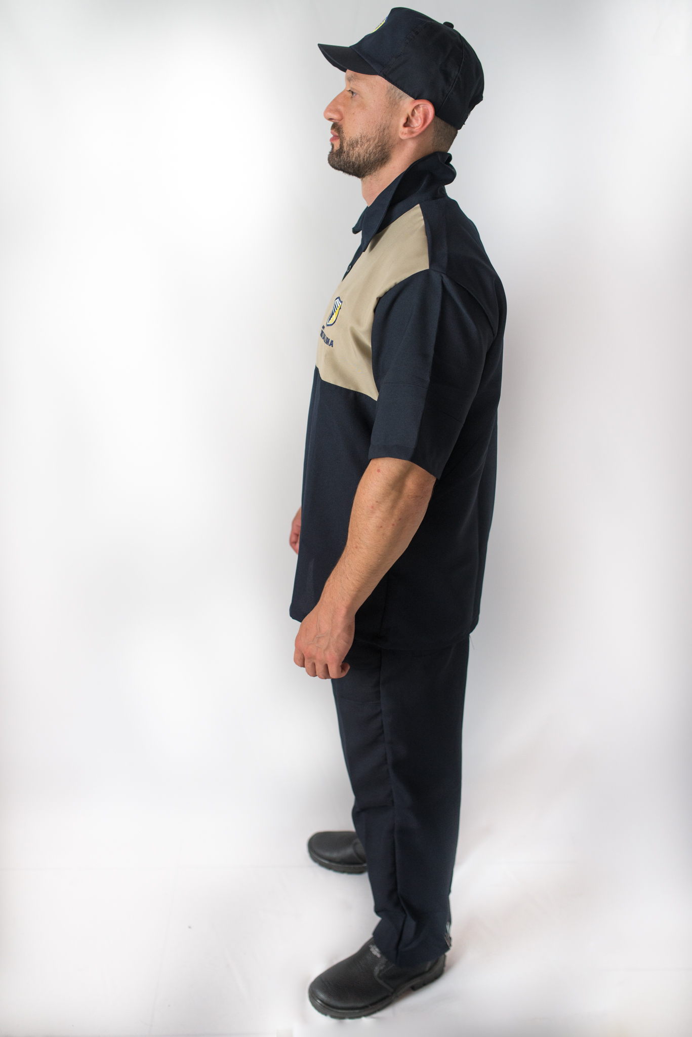 Uniforme de limpeza desenvolvido em tecido oxford, modelagem com maior amplitude, calça com três bolsos sendo dois frontais e um traseiro, cós com elástico total auxiliando no ajuste da peça na cintura, para uniforme masculino boné em oxford com aba curta e para uniforme feminino laço de cabelo com rede.